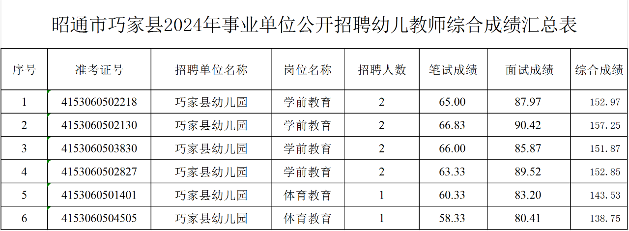 根據(jù)《昭通市2024年事業(yè)單位公開招聘工作人員通告(第一號(hào))》《昭通市2024年事業(yè)單位公開招聘幼兒教師面試通告》,現(xiàn)將綜合成績(jī)公示如下。公示時(shí)間為5個(gè)工作日,若有異議,請(qǐng)聯(lián)系巧家縣教育體育局人事股,聯(lián)系電話:0870-7127016。