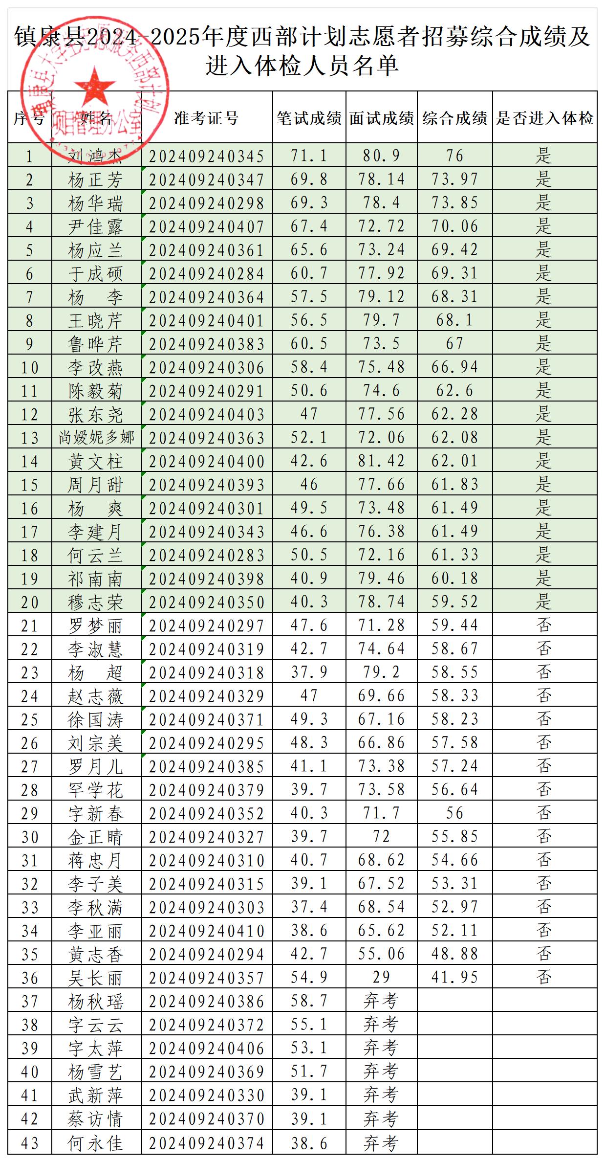 鎮(zhèn)康縣2024—2025年度云南省大學生志愿服務西部計劃地方項目招募面試已經(jīng)結束,現(xiàn)將綜合成績及進入體檢人員名單予以公告(附后)。