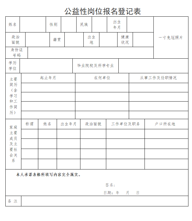 報名要求:需本人到現(xiàn)場報名,不得由他人代辦。報名時需攜帶本人戶口本、有效身份證、《就業(yè)創(chuàng)業(yè)證》(或就業(yè)失業(yè)登記證)復印件各一份、公益性崗位報名表(附后)。