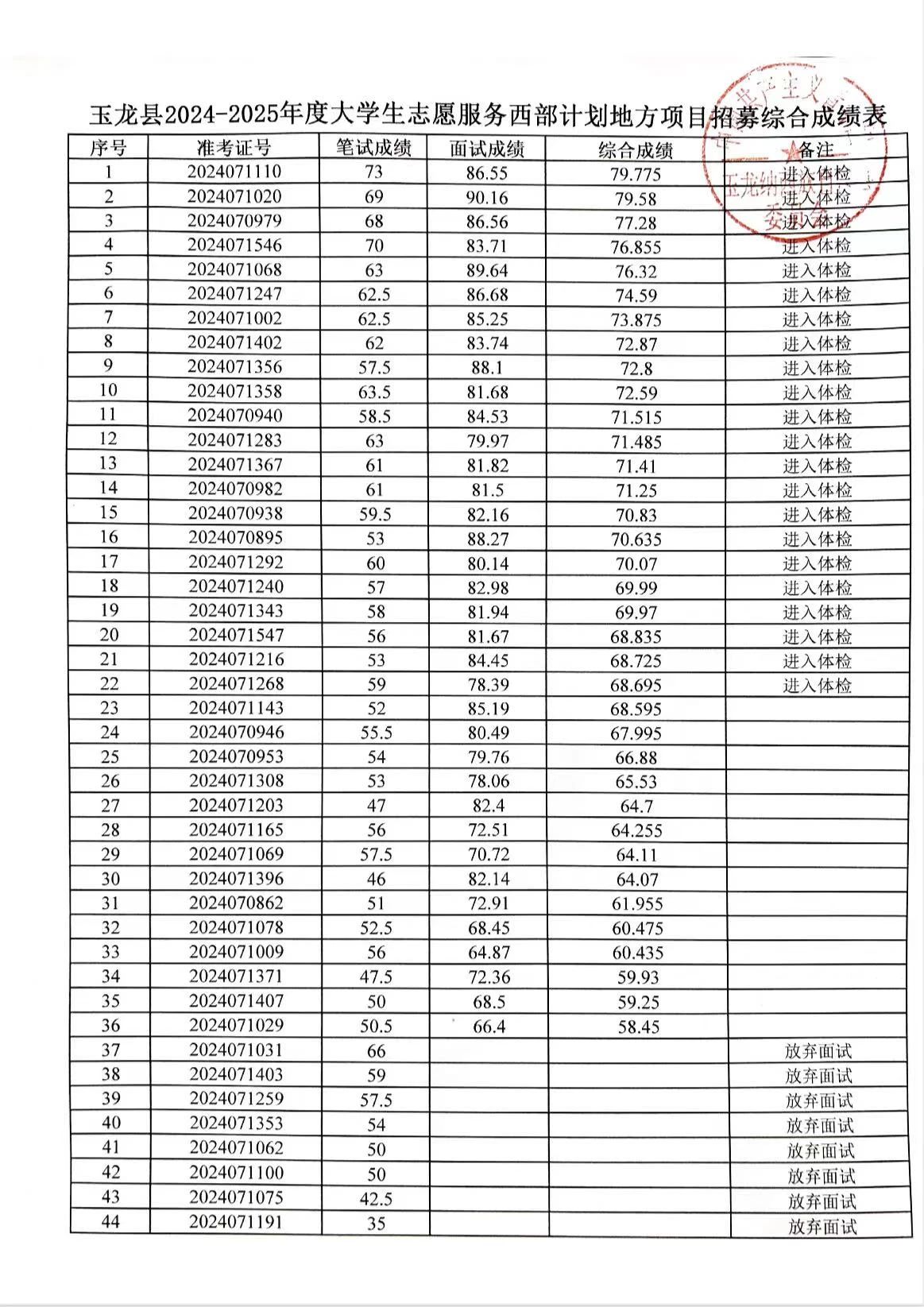 根據(jù)《麗江市2024-2025年度大學(xué)生志愿服務(wù)西部計劃地方項目招募考試公告》,現(xiàn)將綜合成績公示如下。如考生對綜合成績有疑問,請于公示期內(nèi)向縣項目辦提交書面查分申請。