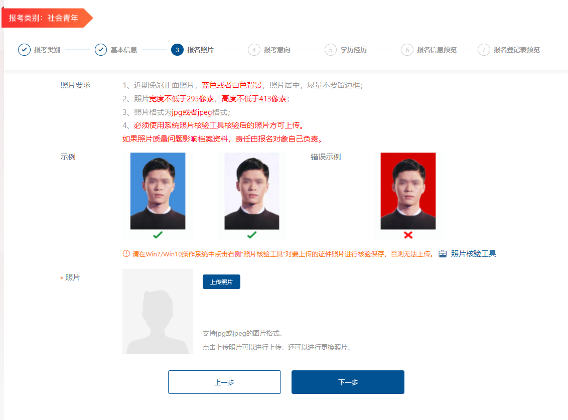 招錄對象需上傳本人證件照片,為本人近期1寸正面免冠彩色證件照片(須為藍(lán)色或白單色背景,295×413像素,JPG或JPEG格式),照片需經(jīng)系統(tǒng)工具處理符合要求后方可上傳。