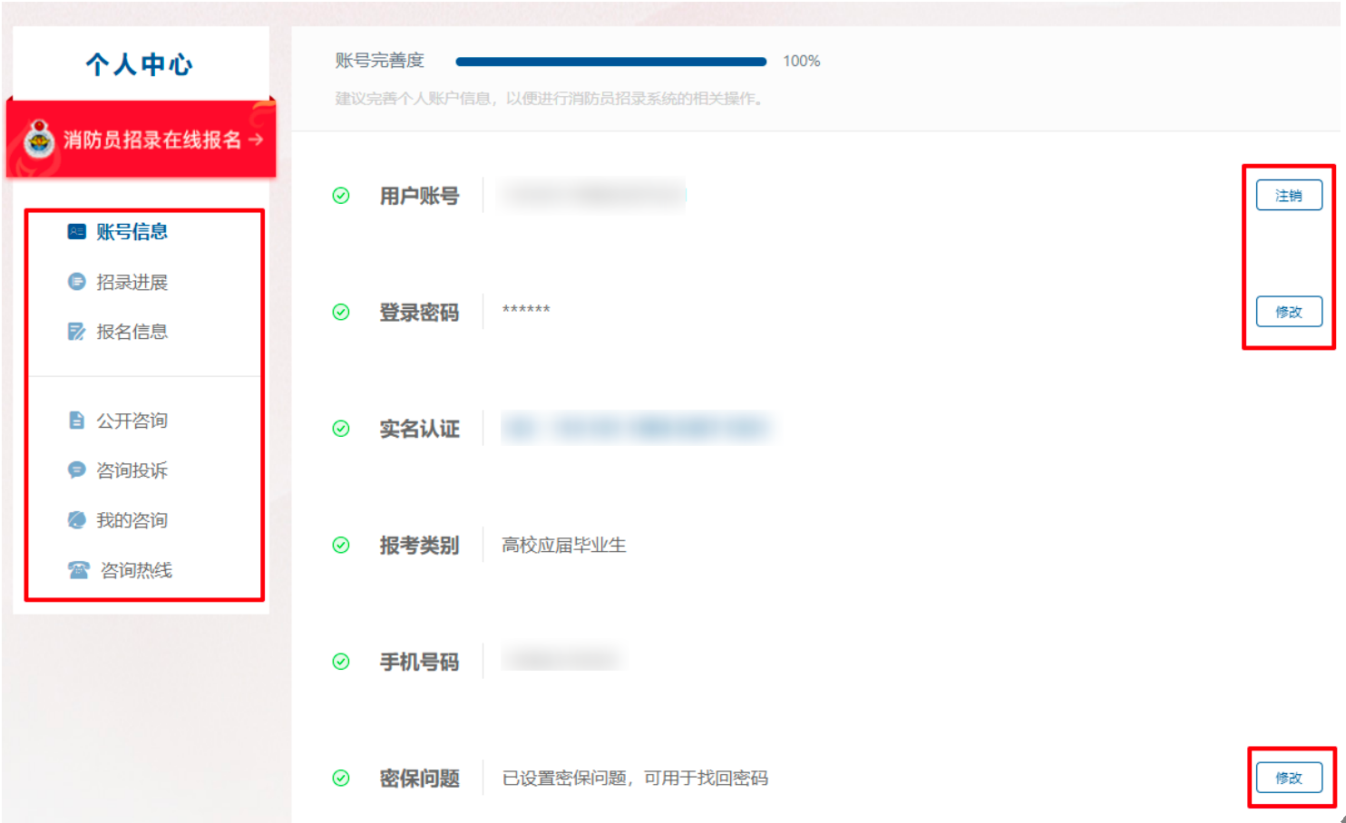 在個人中心可維護(hù)賬號信息、查看招錄進(jìn)展、編輯報名信息和提交咨詢投訴,報名信息提交前,招錄對象如有發(fā)現(xiàn)注冊信息中身份證號及報考類別填寫有誤的,可點擊用戶賬號后的【注銷】按鈕自行注銷當(dāng)前賬號后重新注冊;報名信息提交后,招錄對象不可自行注銷;報名信息提交前,招錄對象如有發(fā)現(xiàn)姓名或身份證正反面照片有誤的,可點擊實名認(rèn)證后的【修改】按鈕進(jìn)行修改;報名信息提交后,如需修改姓名或身份證正反面照片需點擊實名認(rèn)證后的【申請修改】按鈕進(jìn)行申請,管理員審批通過后方可修改。