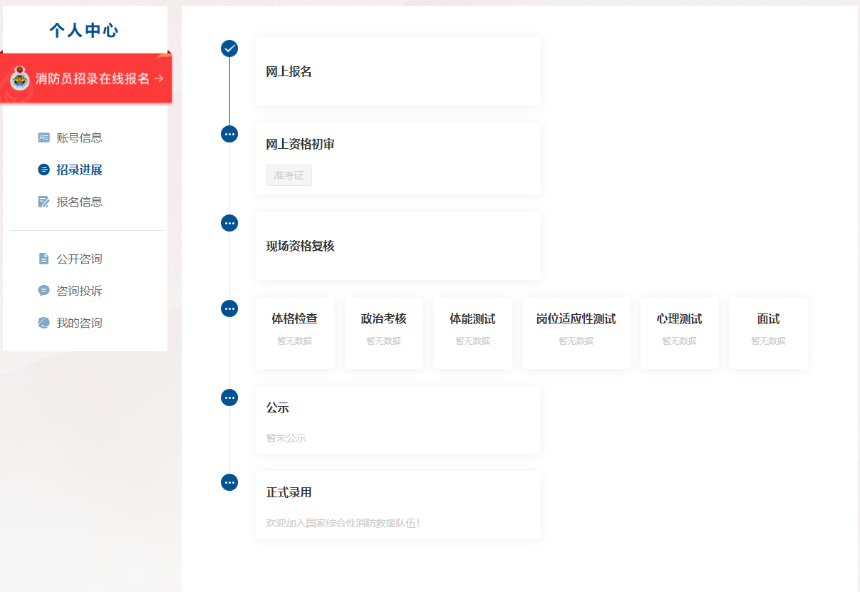招錄對象在報名成功后可隨時查看本人的招錄進(jìn)展。通過資格審查的人員可在線打印準(zhǔn)考證。省級管理員公布本省各項考核結(jié)果后,招錄對象可查看本人各項考核結(jié)果。省級管理員公示本省擬錄用人員名單后,招錄對象可查看本人總成績。省級管理員正式錄用報名對象后,招錄對象可看到本人是否被錄用。