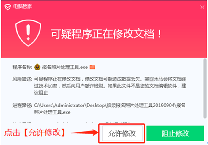 七、如果由于殺毒軟件沒(méi)有關(guān)閉,彈出如下提示時(shí),請(qǐng)點(diǎn)擊【允許修改】按鈕。