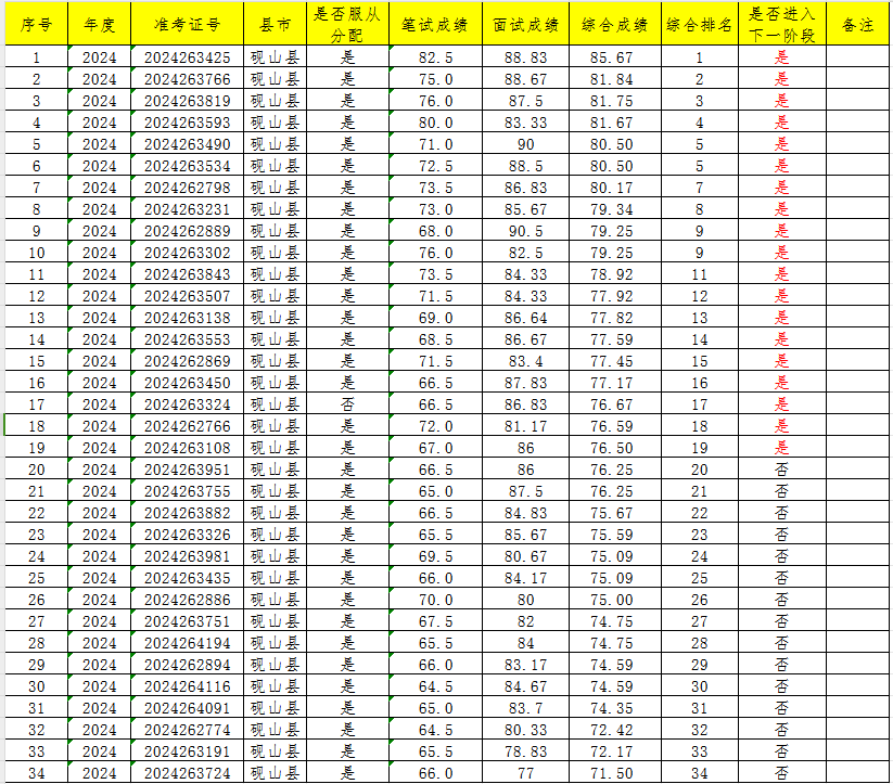 根據(jù)硯山縣2024—2025年度大學(xué)生志愿服務(wù)西部計(jì)劃省級(jí)地方項(xiàng)目志愿者招募程序和《關(guān)于做好2024—2025年度云南省大學(xué)生志愿者服務(wù)西部計(jì)劃地方項(xiàng)目志愿者招募派遣工作的通知》、《關(guān)于做好文山州2024-2025年度西部計(jì)劃省級(jí)地方項(xiàng)目志愿者招募工作的通知》文件要求,硯山縣大學(xué)生西部計(jì)劃項(xiàng)目管理辦公室已于7月4日舉行了公開面試,現(xiàn)將招募人員筆試成績(jī)、面試成績(jī)、綜合成績(jī)(筆試成績(jī)×50%+面試成績(jī)×50%,面試、綜合成績(jī)通過(guò)計(jì)算四舍五入保留兩位小數(shù)。)公示如下(公示時(shí)間為2024年7月5日-2023年7月9日):