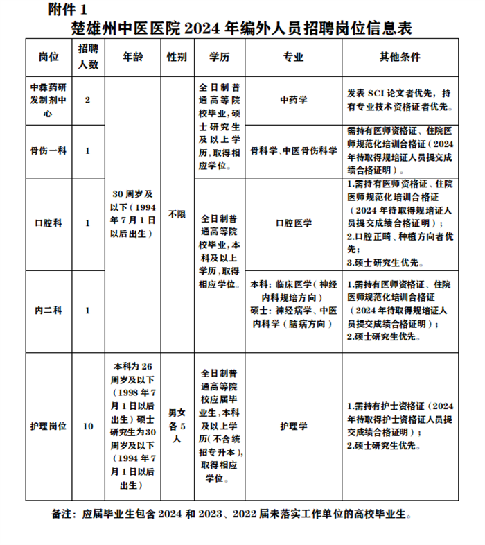 本次編外人員招聘具體崗位及人數(shù)詳見《楚雄州中醫(yī)醫(yī)院2024年編外人員招聘崗位信息表》(附件1)。