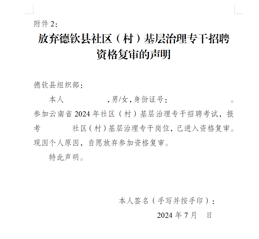 2.《放棄德欽縣社區(qū)(村)基層治理專干招聘資格復(fù)審的聲明》