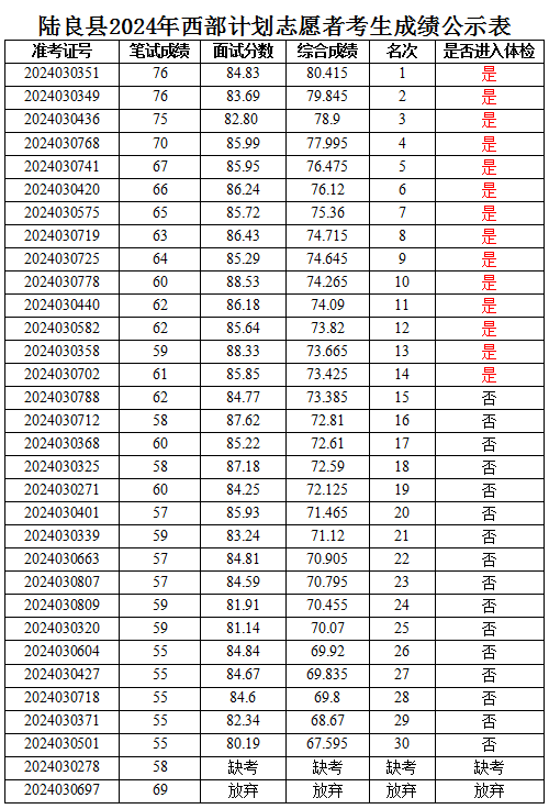 根據(jù)《關(guān)于做好2024—2025年度云南省大學(xué)生志愿服務(wù)西部計(jì)劃地方項(xiàng)目志愿者招募派遣工作的通知》精神及《2024年西部計(jì)劃云南省地方項(xiàng)目志愿者招募公告》《云南省曲靖市關(guān)于2024年大學(xué)生志愿服務(wù)西部計(jì)劃地方項(xiàng)目志愿者招募的公告》有關(guān)規(guī)定和要求,陸良縣項(xiàng)目辦本著堅(jiān)持德才兼?zhèn)涞挠萌藰?biāo)準(zhǔn)和公開、平等、競爭、擇優(yōu)的原則,于2024年7月6日組織了面試相關(guān)工作,現(xiàn)將陸良縣2024年招募大學(xué)生志愿服務(wù)西部計(jì)劃省級地方項(xiàng)目志愿者面試成績、綜合成績及進(jìn)入體檢人員名單進(jìn)行公示: