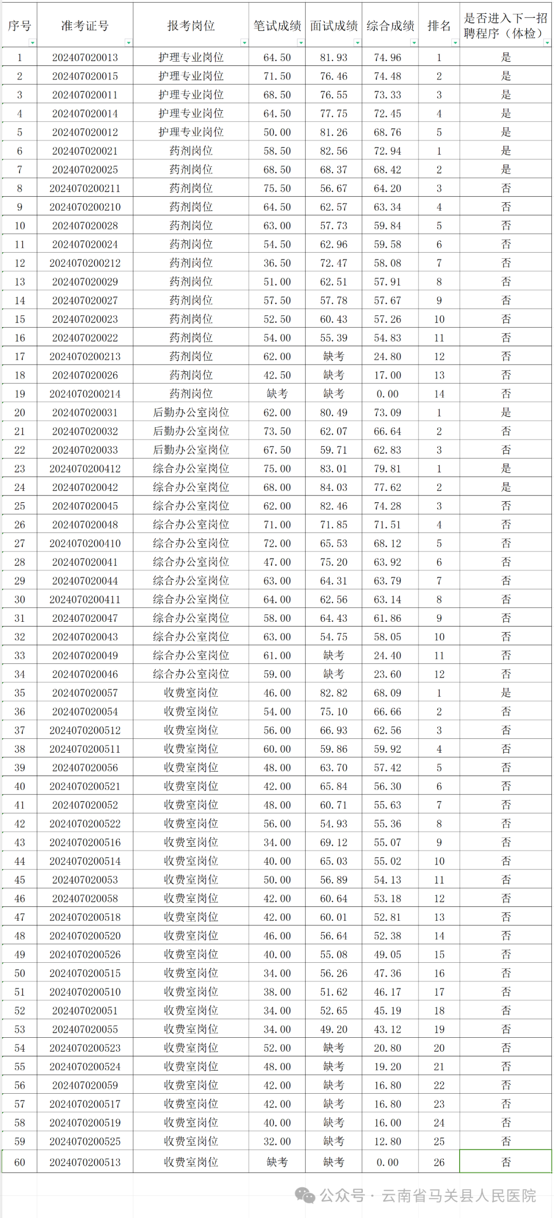 根據(jù)《馬關(guān)縣人民醫(yī)院2024年編外合同職工招聘公告》要求,我院按照程序于2024年7月2日對報(bào)考人員進(jìn)行了筆試,2024年7月4日和2024年7月5日進(jìn)行了面試,現(xiàn)將考試成績予以公示如下: