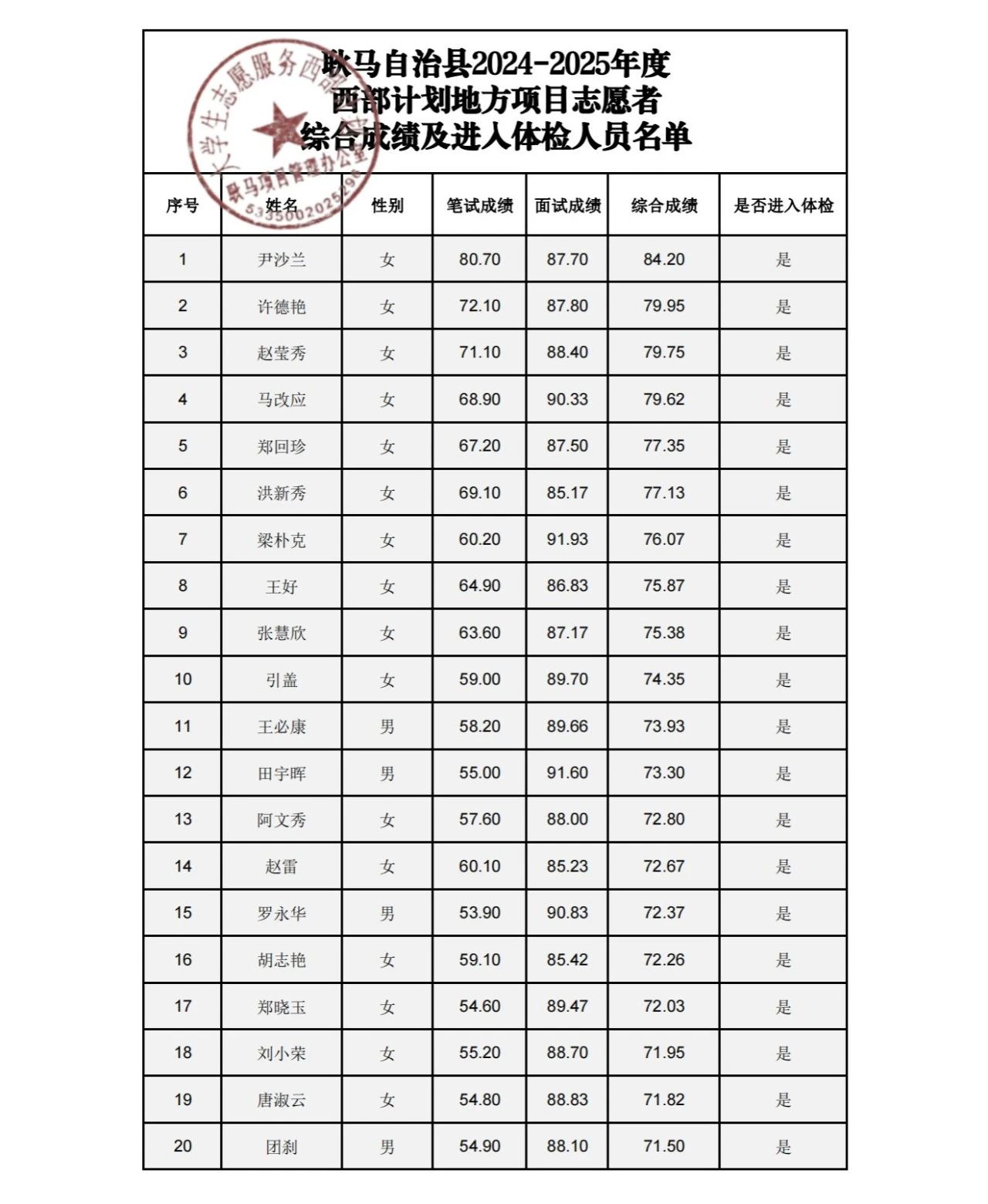 西部計(jì)劃地方項(xiàng)目志愿者綜合成績及進(jìn)入體檢名單公示