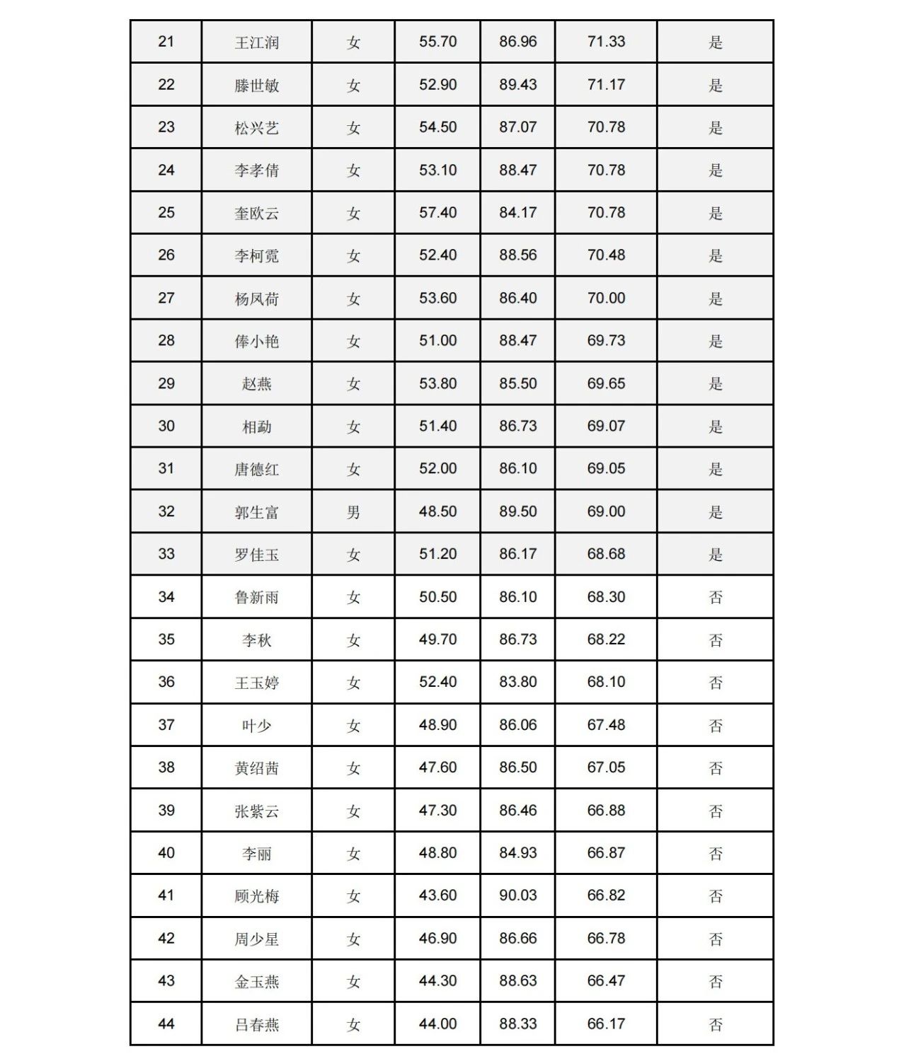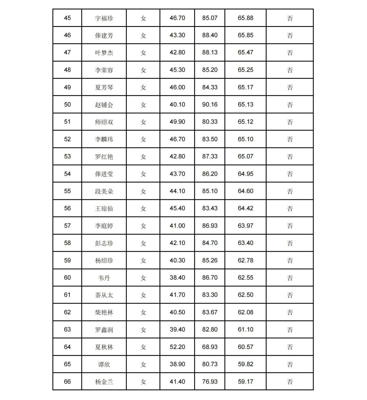 耿馬自治縣2024-2025年度西部計(jì)劃大學(xué)生志愿者招募面試工作現(xiàn)已結(jié)束,經(jīng)報(bào)名、資格審核、筆試等程序,共有66人進(jìn)入面試?,F(xiàn)將綜合成績公告如下:(綜合成績=筆試成績*50%+面試成績*50%)