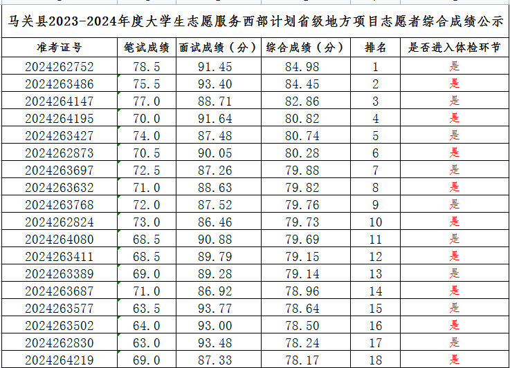 根據(jù)馬關(guān)縣2024—2025年度大學(xué)生志愿服務(wù)西部計(jì)劃省級(jí)地方項(xiàng)目志愿者招募程序和《關(guān)于做好2024—2025年度云南省大學(xué)生志愿者服務(wù)西部計(jì)劃地方項(xiàng)目志愿者招募派遣工作的通知》《關(guān)于做好文山州2024—2025年度西部計(jì)劃省級(jí)地方項(xiàng)目志愿者招募工作的通知》文件要求,馬關(guān)縣大學(xué)生志愿服務(wù)西部計(jì)劃項(xiàng)目管理辦公室已于2024年7月4日舉行了面試,現(xiàn)將參加面試人員綜合成績(jī)公示如下,公示時(shí)間為三個(gè)工作日(2024年7月5日—7月9日):