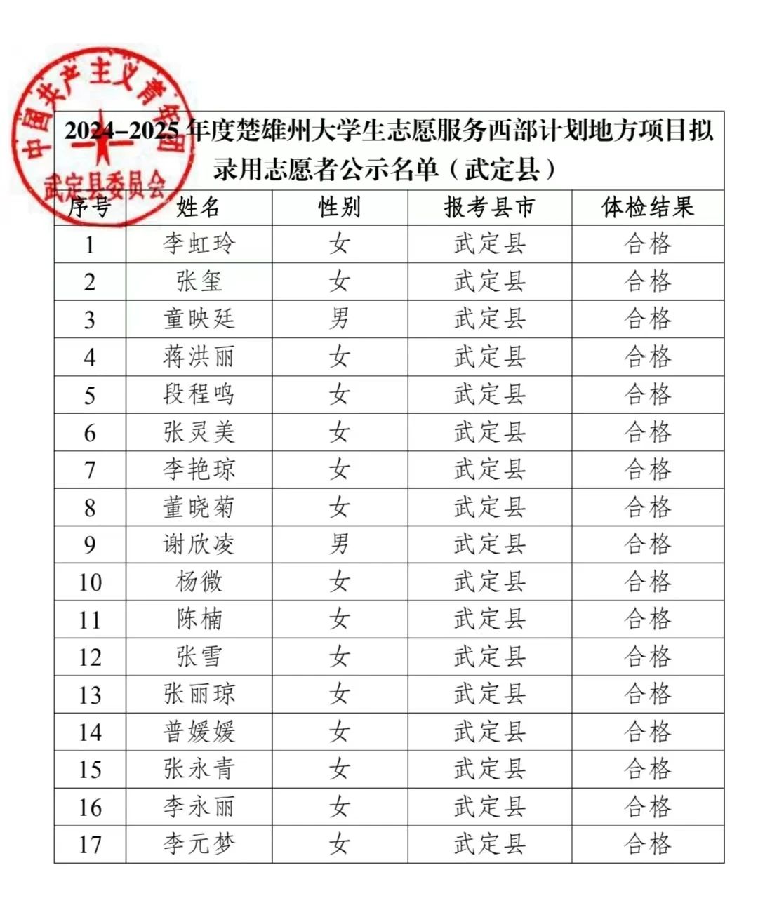 根據(jù)《楚雄州2024-2025年度大學生志愿服務西部計劃省級地方項目實施方案》《楚雄州2024-2025年度大學生志愿服務西部計劃省級地方項目志愿者招募公告》的相關要求,現(xiàn)已完成武定縣2024—2025年度大學生志愿服務西部計劃省級地方項目志愿者招募工作。擬新招募17名志愿者,現(xiàn)將擬錄用人員名單進行公示(名單附后)。
