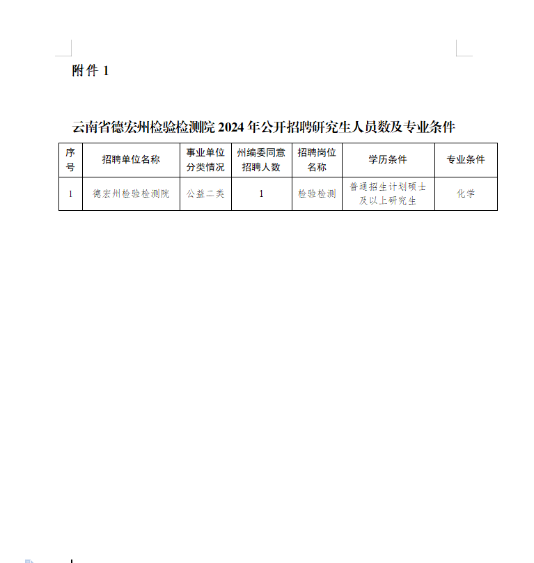 附件:1.云南省德宏州檢驗(yàn)檢測(cè)院2024年公開招聘研究生人員數(shù)及專業(yè)條件