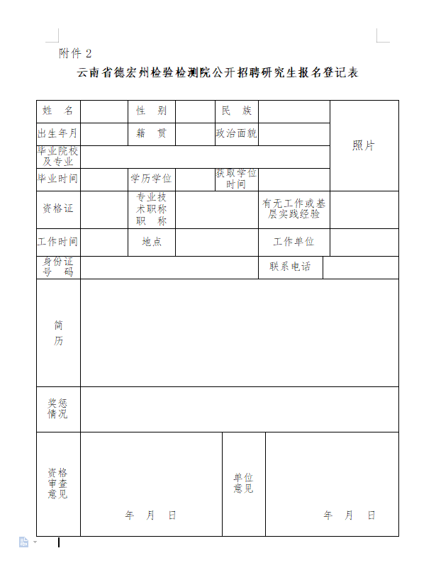 2.云南省德宏州檢驗(yàn)檢測(cè)院公開招聘研究生報(bào)名登記表