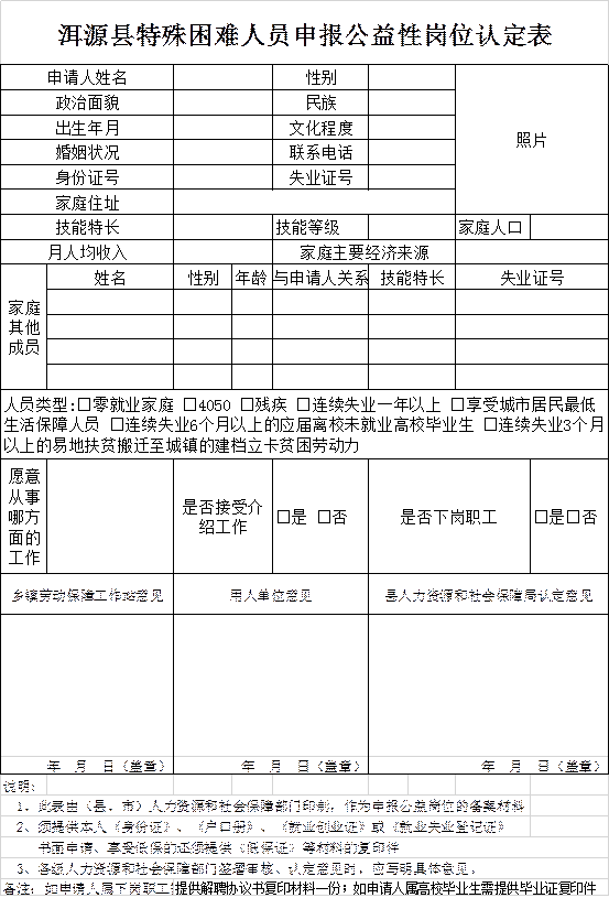 (三)報名須攜帶的材料:公益性崗位申請書(自行準備),《洱源縣公益性崗位申報表》(附后)、畢業(yè)證(學(xué)位證)、《就業(yè)創(chuàng)業(yè)證》復(fù)印件、身份證復(fù)印件、戶口冊原件及復(fù)印件。
