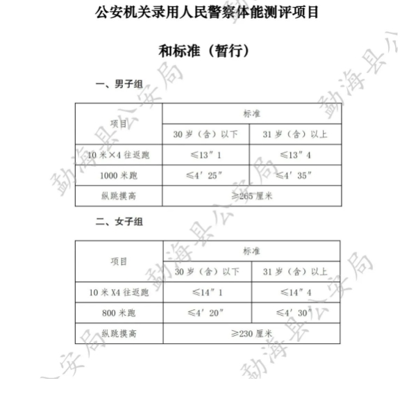 測評項目:男子:縱跳摸高、10米×4往返跑、1000米;女子:縱跳摸高、10米×4往返跑、800米。體能測評原則上參照《公安機關錄用人民警察體能測評項目和標準(暫行)》(詳情見附件)執(zhí)行,合格者進入筆試、面試環(huán)節(jié)。