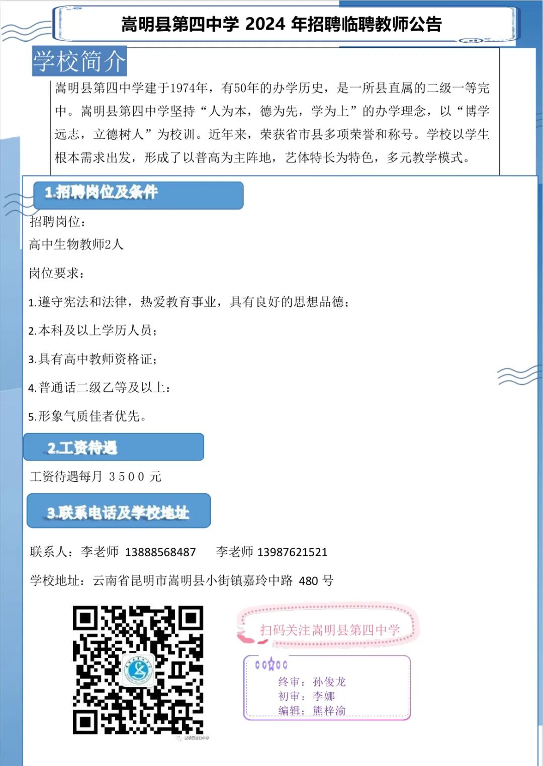 嵩明縣第四中學2024年招聘臨聘教師公告 來源:https://mp.weixin.qq.com/s/utpjPwWq6LwrS0EcKJBvtA