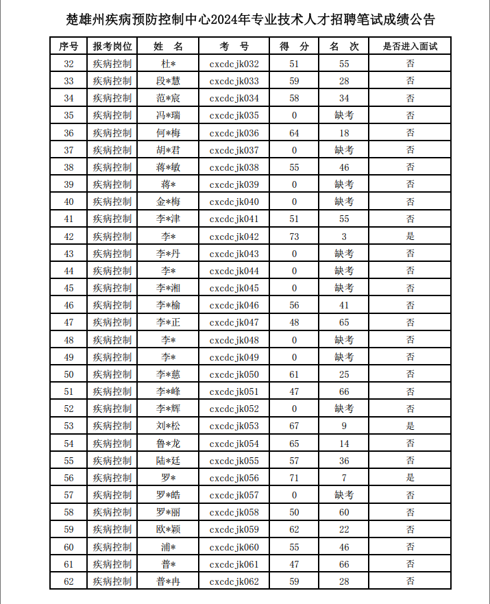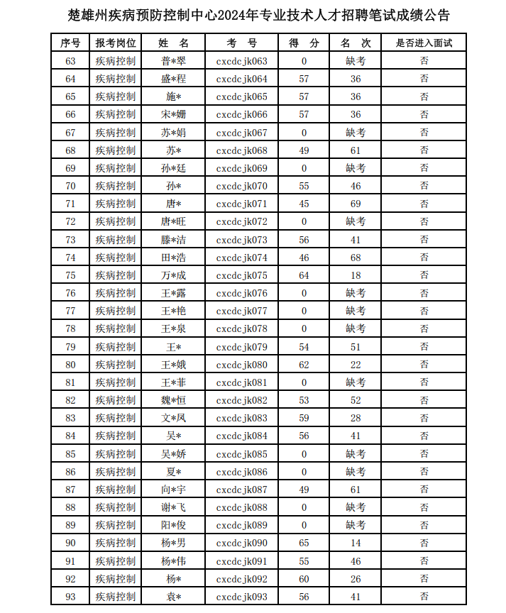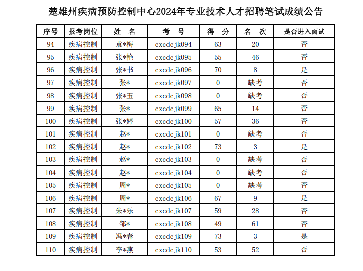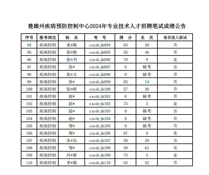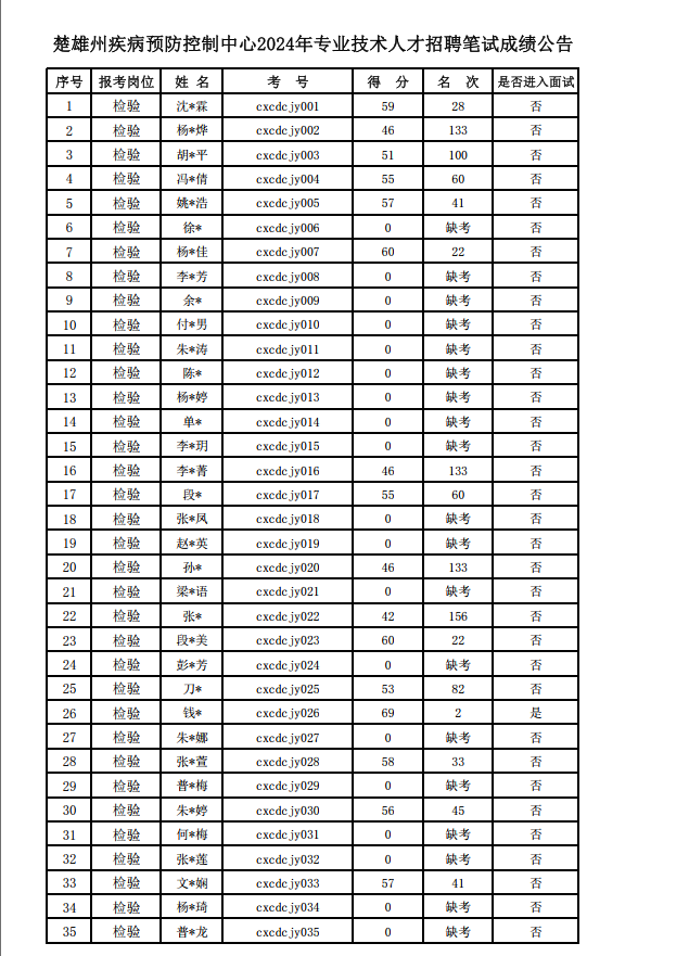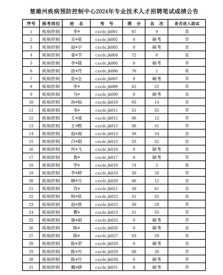 楚雄州疾病預防控制中心2024年專業(yè)技術人才招聘筆試考試已結(jié)束。現(xiàn)將成績公告如下: