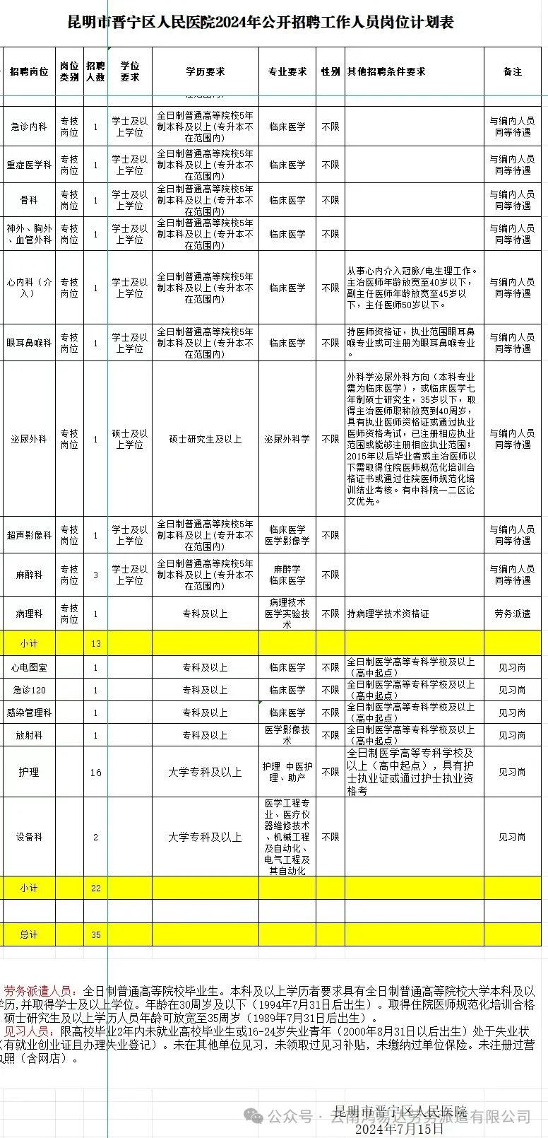 詳見《昆明市晉寧區(qū)人民醫(yī)院2024年公開招聘工作人員崗位計劃表》。