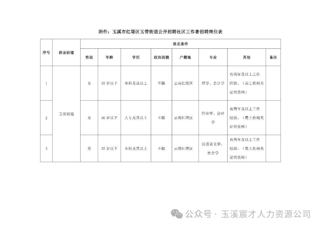 因工作需要,玉溪市紅塔區(qū)玉帶街道委托玉溪宸才人力資源咨詢管理有限公司面向社會(huì)公開招聘社區(qū)工作者5名,現(xiàn)將有關(guān)事項(xiàng)公告如下: