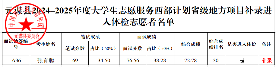 根據(jù)共青團(tuán)云南省委、云南省教育廳、云南省財(cái)政廳、云南省人力資源和社會(huì)保障廳《關(guān)于印發(fā)〈2024—2025年度云南省大學(xué)生志愿服務(wù)西部計(jì)劃實(shí)施方案〉的通知》和云南省大學(xué)生志愿服務(wù)西部計(jì)劃項(xiàng)目管理辦公室《關(guān)于做好2024—2025年度云南省大學(xué)生志愿服務(wù)西部計(jì)劃地方項(xiàng)目志愿者招募派遣工作的通知》要求,元謀縣2024—2025年度大學(xué)生志愿服務(wù)西部計(jì)劃地方項(xiàng)目志愿者招募考試工作已經(jīng)結(jié)束,各報(bào)考人員綜合成績(jī)的計(jì)算方法是:綜合成績(jī)=筆試成績(jī)×50%+面試成績(jī)×50%。筆試、面試均采取百分制計(jì)分,綜合成績(jī)保留小數(shù)點(diǎn)后2位。因本次招募有1人自愿放棄,依次遞補(bǔ)1名志愿者進(jìn)入體檢,現(xiàn)將元謀縣2024-2025年度大學(xué)生志愿服務(wù)西部計(jì)劃省級(jí)地方項(xiàng)目補(bǔ)錄進(jìn)入體檢志愿者名單予以公告: