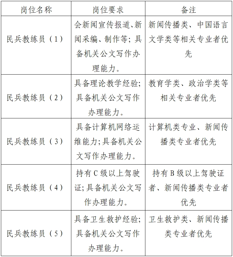 根據(jù)有關(guān)規(guī)定和工作需要,澄江市人民武裝部擬招聘民兵教練員5名。現(xiàn)將有關(guān)事項公告如下: