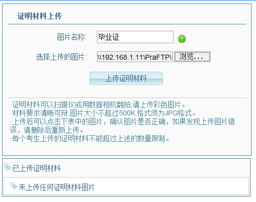 9、在“材料名稱”項(xiàng)目中輸入“畢業(yè)證書”,點(diǎn)擊“瀏覽”,選擇所要上傳的圖片,然后點(diǎn)擊“上傳圖片材料”,到此,所需證明材料上傳成功。可以看到頁面上顯示“現(xiàn)已上傳1張”,如下:
