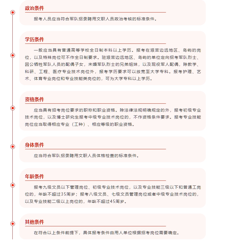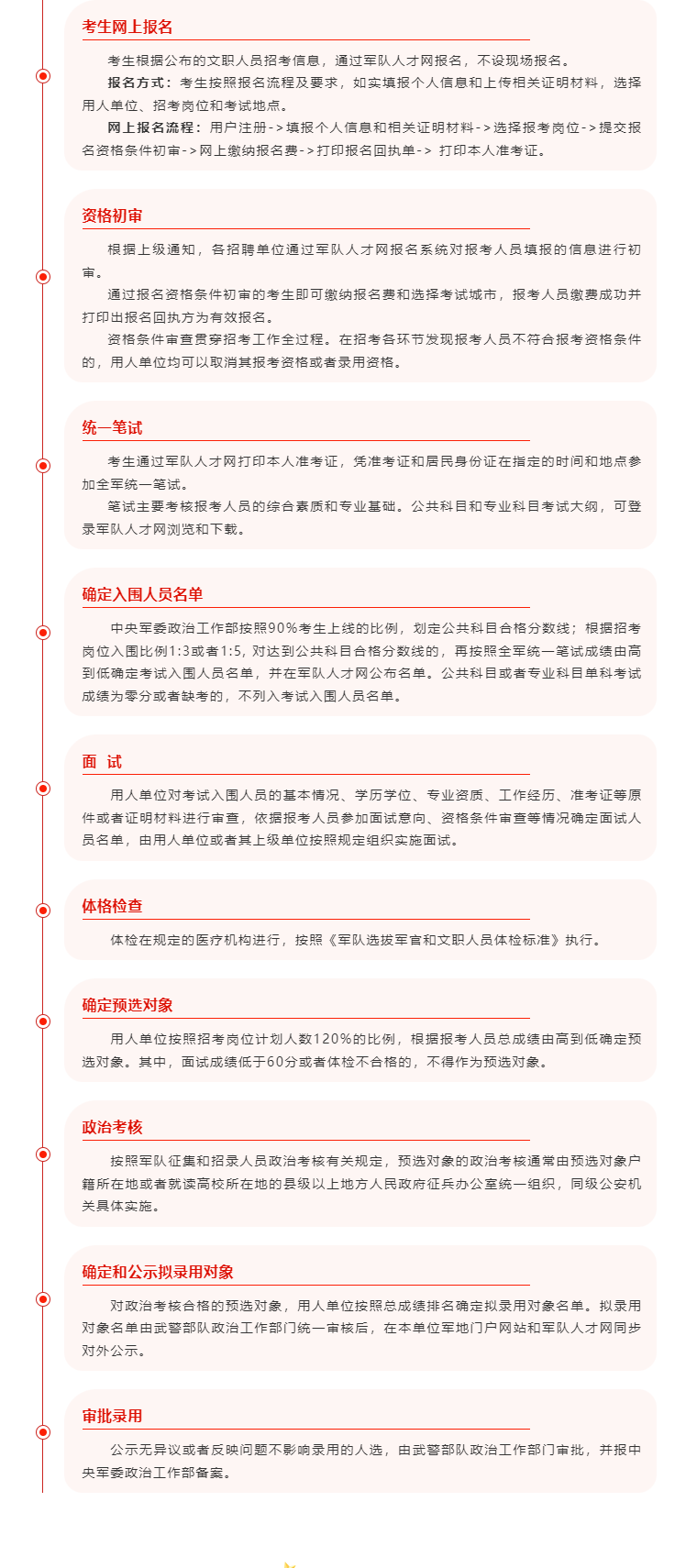特別提醒:報(bào)考人員必須通過(guò)軍隊(duì)人才網(wǎng)報(bào)名,請(qǐng)勿輕信其他形式和途徑的招聘。招聘統(tǒng)一筆試和面試不指定輔導(dǎo)用書(shū),不舉辦也不委托任何機(jī)構(gòu)開(kāi)設(shè)輔導(dǎo)班,報(bào)考人員可依據(jù)軍隊(duì)人才網(wǎng)公布的考試大綱做好準(zhǔn)備。