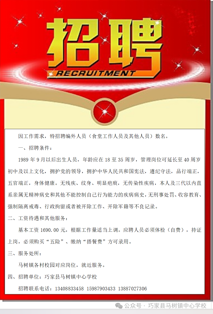 馬樹鎮(zhèn)中心學(xué)校編外人員招聘公告