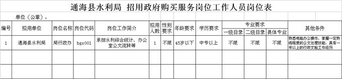 一、招用崗位(詳見《通??h水利局招用政府購買服務(wù)崗位工作人員崗位表》)