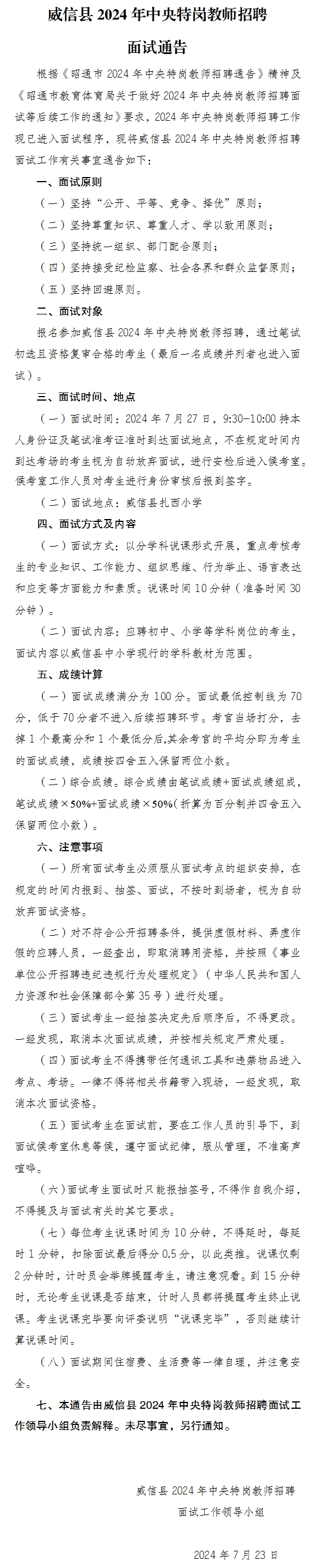 2024年昭通市威信縣中央特崗教師招聘面試通告