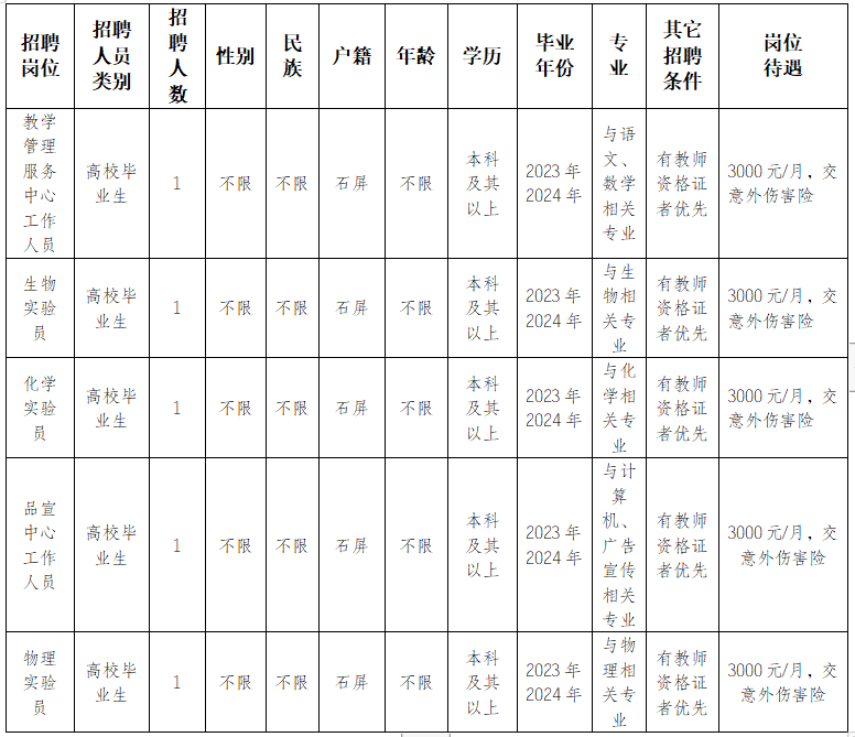 因工作需要,云南省石屏縣第一中學需要招聘見習性崗位人員5名,具體條件如下: