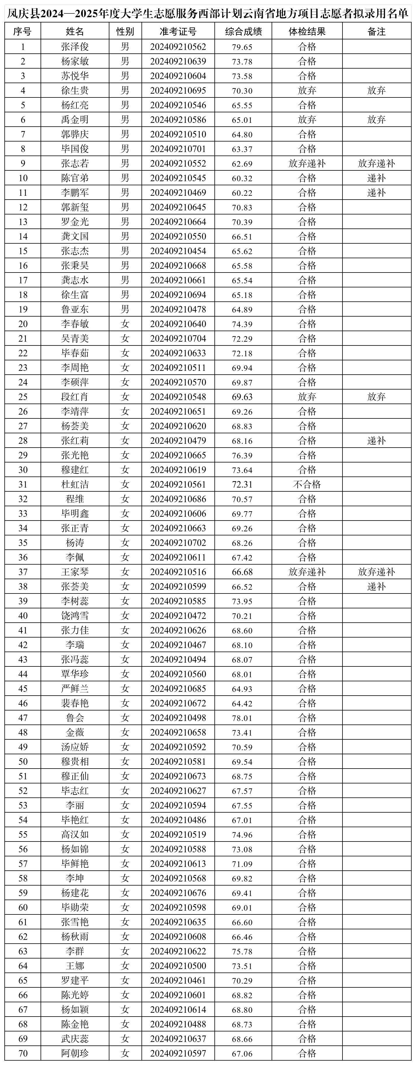 根據(jù)臨滄市項目辦《關于做好2024-2025年度云南省大學生志愿服務西部計劃地方項目志愿者招募派遣工作的通知》(云志項辦通〔2024〕2號文件)及有關要求,經(jīng)過筆試、資格復審、面試、體檢等程序,擬錄用張澤俊等64名應屆畢業(yè)生為鳳慶縣大學生志愿服務西部計劃云南省地方項目志愿者,現(xiàn)予以公示: