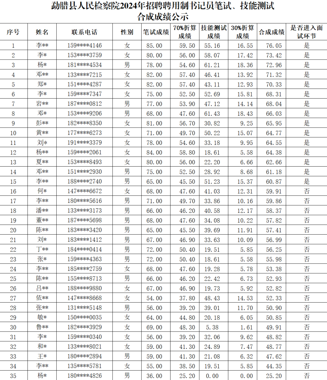 根據(jù)勐臘縣人民檢察院2024年度下半年招聘省級(jí)聘用制書記員工作安排,現(xiàn)將筆試、技能測試合成成績公示如下: