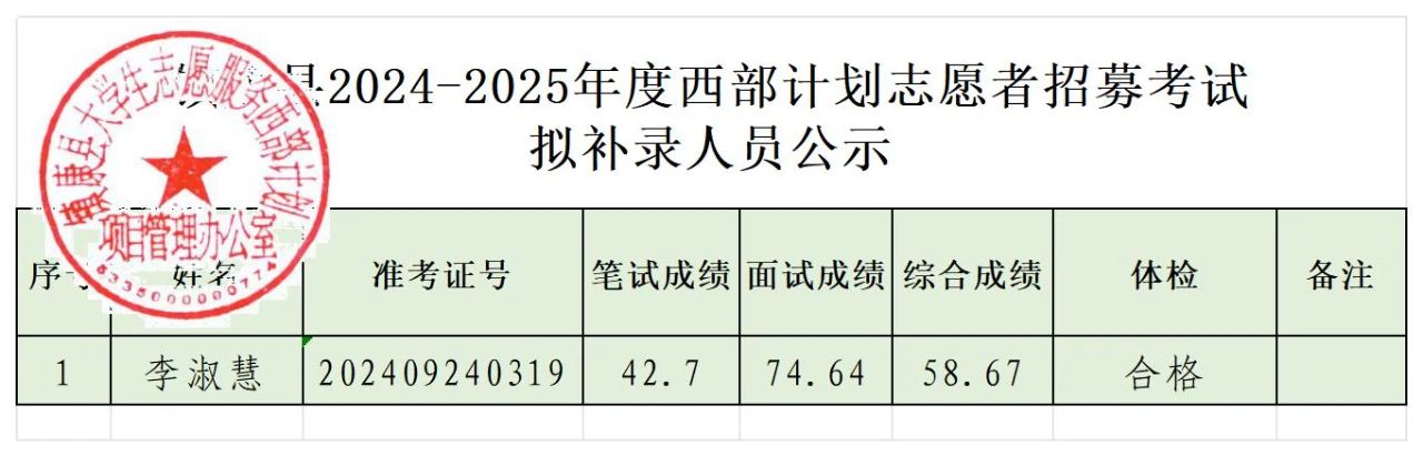 根據(jù)《關于做好2024—2025年度云南省大學生志愿服務西部計劃地方項目志愿者招募派遣工作的通知》(云志項辦通〔2024〕2號文件)及臨滄市項目辦有關要求,縣項目辦擬對空缺的1個志愿者崗位按綜合成績排名從高到低順序(當綜合成績排名并列時,面試成績高者確定為錄用人選)及體檢結果進行補錄。