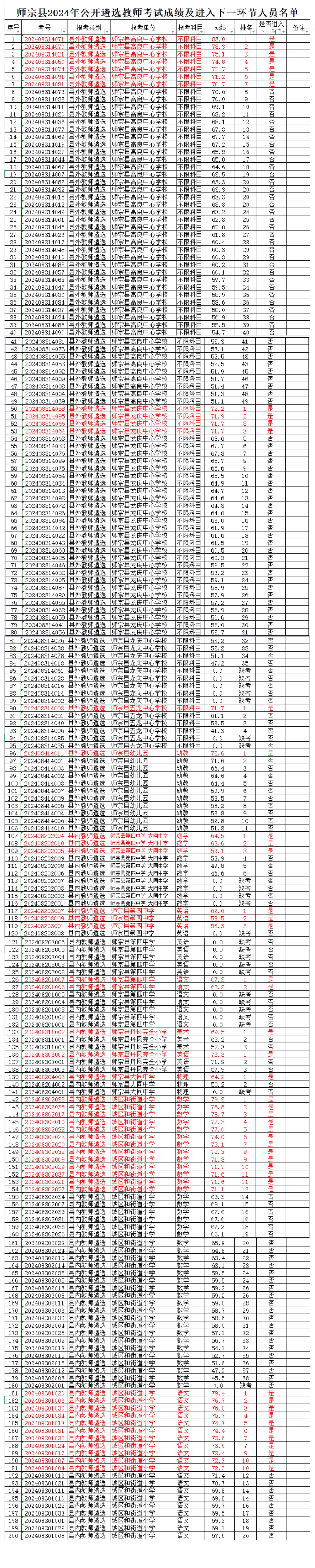根據(jù)《中共師宗縣委 師宗縣人民政府關(guān)于深化教育改革實現(xiàn)教育高質(zhì)量發(fā)展的實施意見》(師發(fā)〔2019〕33號)《中共師宗縣委辦公室 師宗縣人民政府辦公室關(guān)于印發(fā)〈師宗縣機關(guān)事業(yè)單位公開遴選工作人員實施辦法(試行)〉的通知》(師辦發(fā)〔2018〕5號)《師宗縣教育體育局關(guān)于印發(fā)〈師宗縣教育體育局關(guān)于規(guī)范學校內(nèi)設(shè)機構(gòu)和人員配置辦法〉(試行)等七個制度的通知》(師教體發(fā)〔2019〕18號)《師宗縣教育體育局關(guān)于進一步規(guī)范教師交流輪崗等工作的通知》(師教體通〔2022〕36號)等文件精神及《曲靖市師宗縣2024年公開遴選教師公告》和《師宗縣2024年城區(qū)(街道)學校公開遴選教師公告》規(guī)定,師宗縣2024年學校公開遴選教師工作通過發(fā)布公告、報名、資格審核、考試等程序,現(xiàn)將考試成績及進入下一環(huán)節(jié)人員名單(見附件)公告如下。