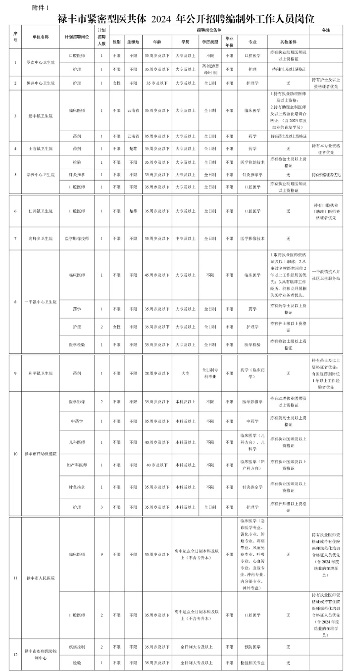 附件:1.祿豐市緊密型醫(yī)共體2024年公開招聘編制外工作人員崗位信息表;