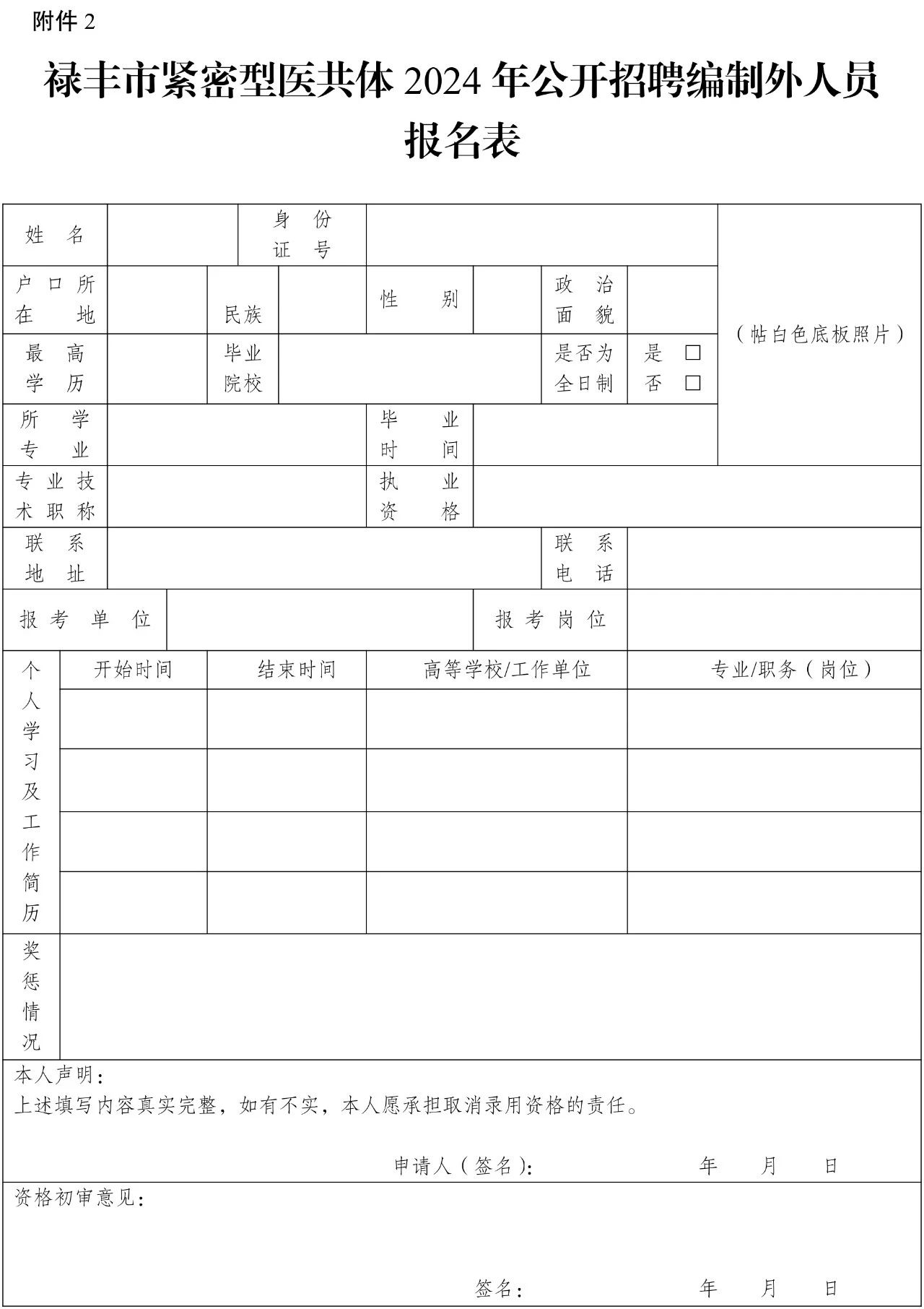 1.《祿豐市緊密型醫(yī)共體公開招聘編制外人員報名表》附件2,一式1份,粘貼近期免冠小1寸白色底版證件照;
