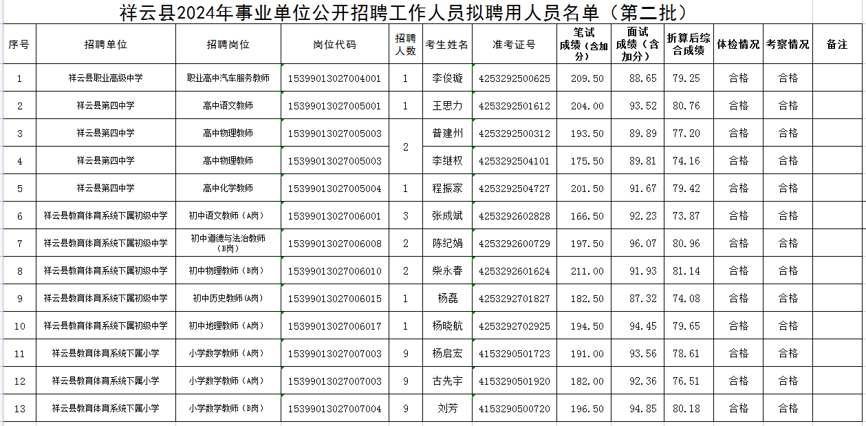 根據(jù)《大理州2024年事業(yè)單位公開招聘工作人員公告》規(guī)定,祥云縣教育體育局完成體檢、考察等工作,李俊璇等13名同志體檢、考察合格?,F(xiàn)將祥云縣2024年事業(yè)單位公開招聘工作人員擬聘用人員(第二批)予以公示,公示時間7個工作日:2024年7月30日--8月7日,公示期間,如有異議,請向祥云縣人力資源和社會保障局事業(yè)單位管理股反映。