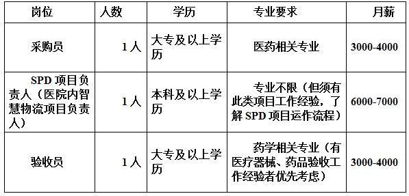 SPD項目負(fù)責(zé)人:1.物流及相關(guān)專業(yè)??萍耙陨蠈W(xué)歷;2..醫(yī)藥或醫(yī)療器械物流管理工作經(jīng)驗;3.熟悉醫(yī)院器械產(chǎn)品或藥品作業(yè)流程。4.具有一定的SPD項目管理能力和經(jīng)驗,能做好項目整體規(guī)劃和管理。