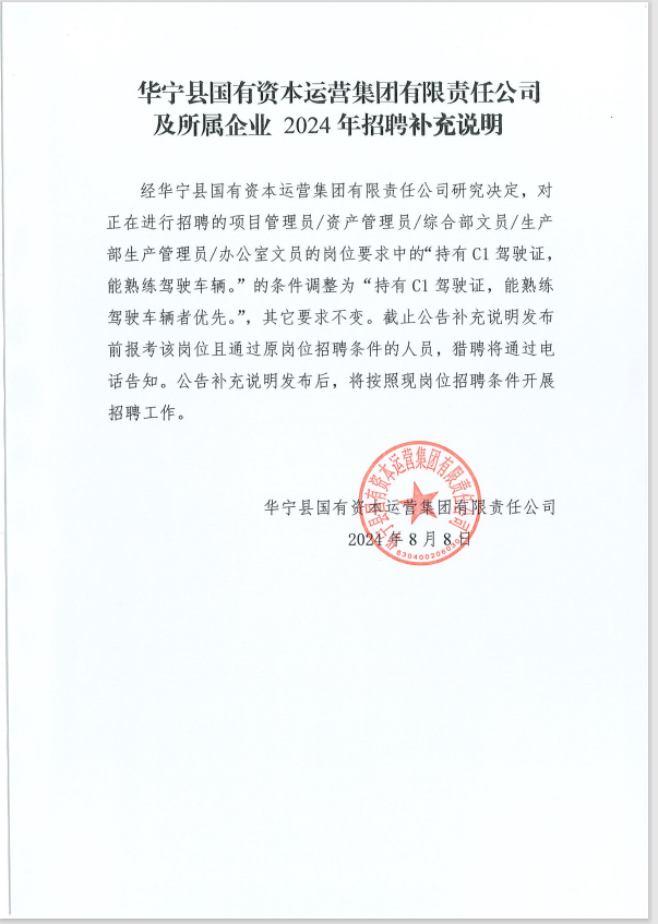 2024年計(jì)劃公開招聘工作人員15人。招聘單位、崗位、人數(shù)及報(bào)名條件詳見《華寧縣國有資本運(yùn)營集團(tuán)有限責(zé)任公司及所屬企業(yè) 2024年招聘崗位表》。