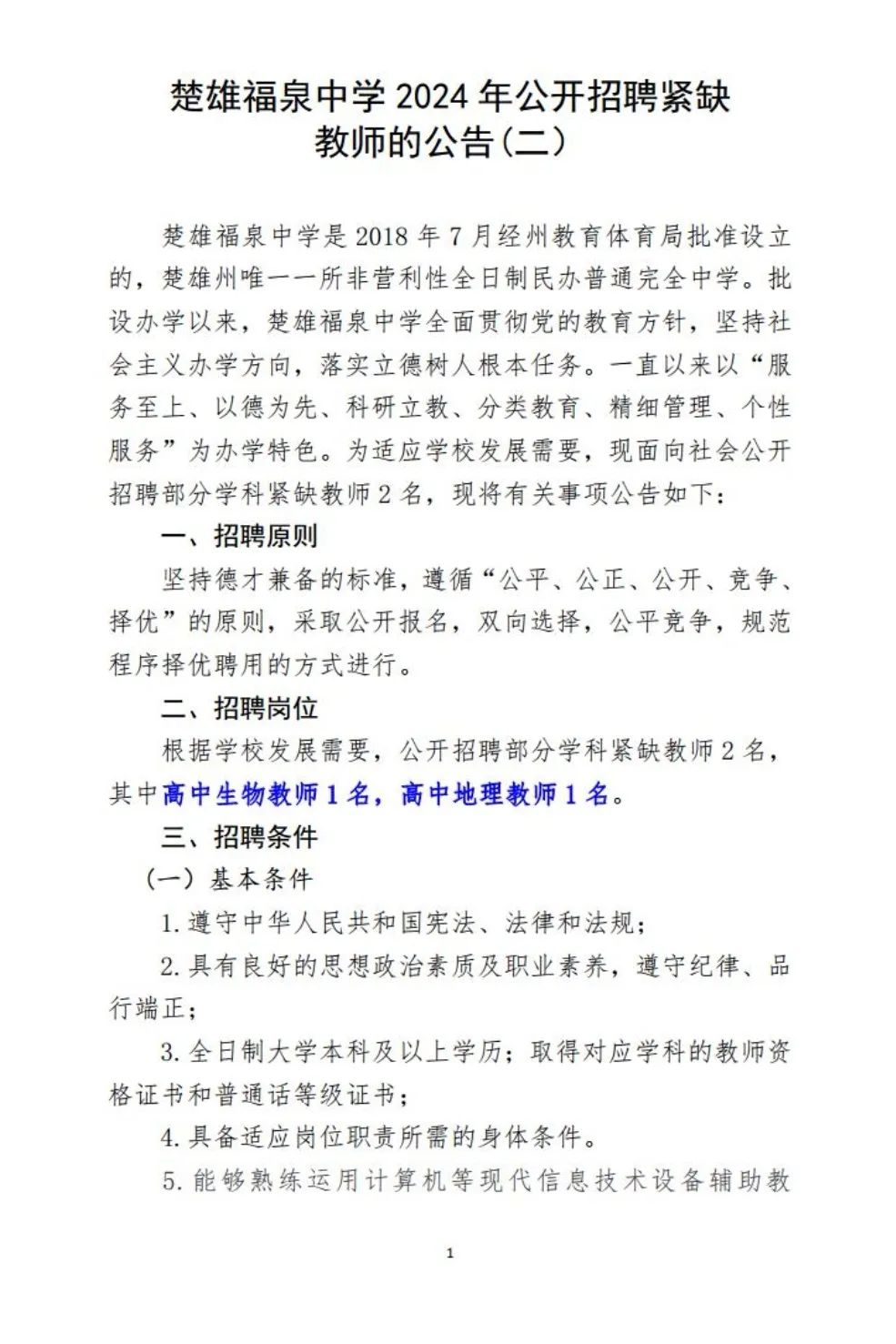 楚雄福泉中學2024年公開招聘緊缺教師的公告(二)