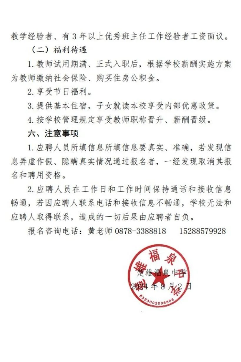 2024年楚雄福泉中學招聘緊缺教師的公告(二)