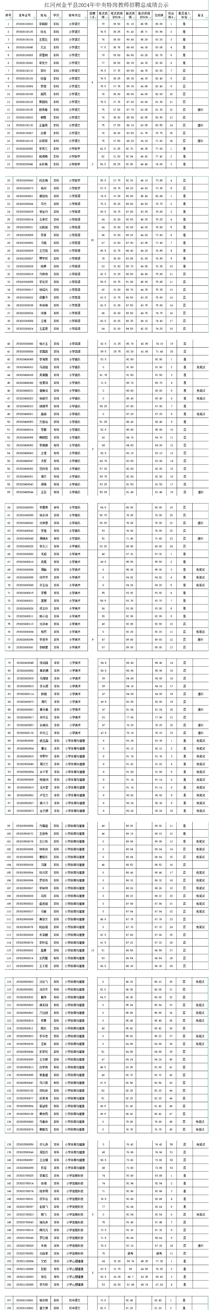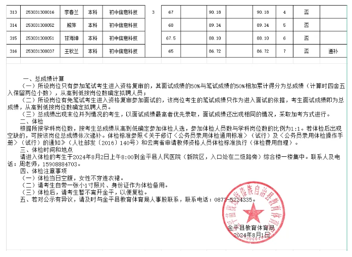 紅河州金平縣2024年中央特崗教師招聘成績公示