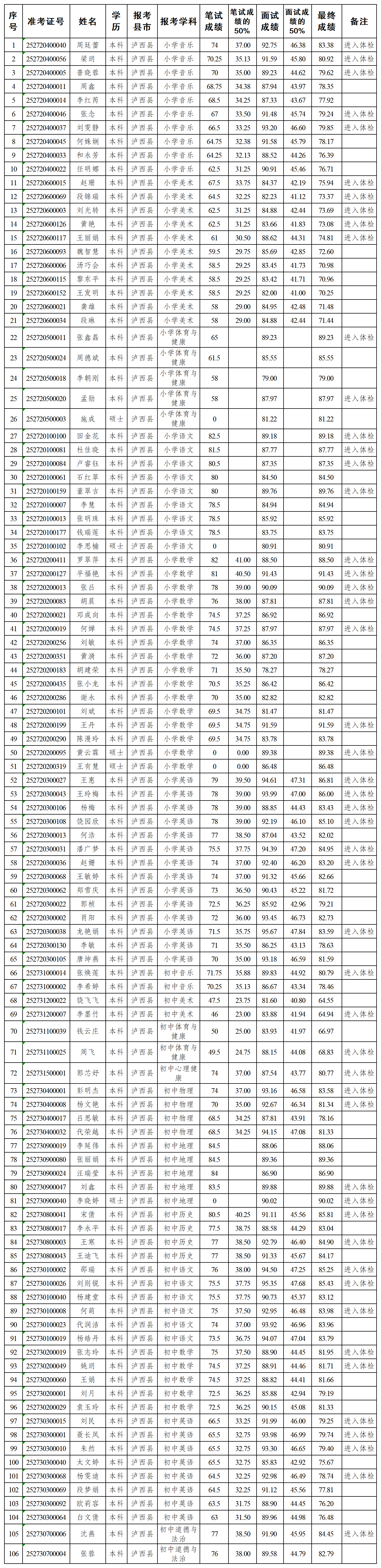 瀘西縣2024年中央特崗教師招聘成績(jī)公告