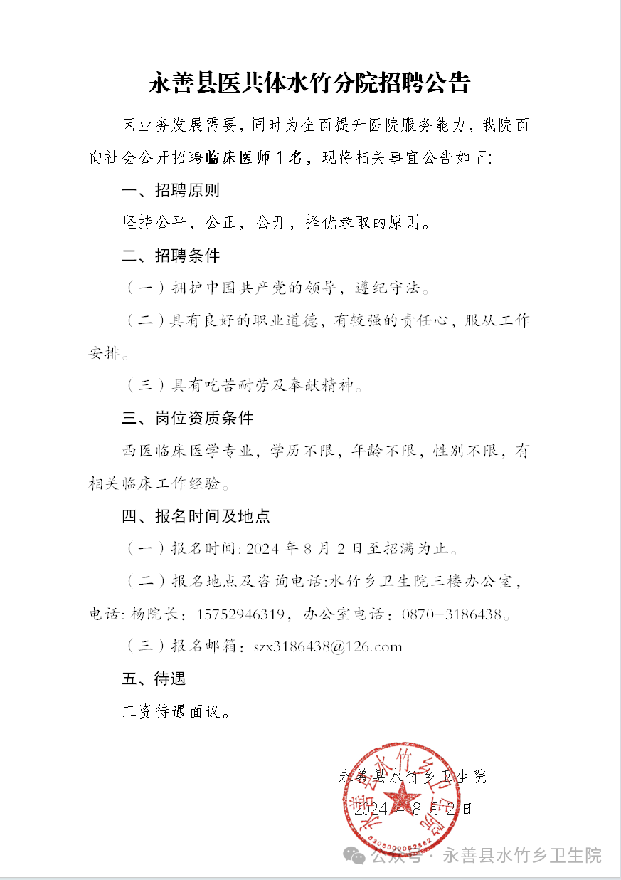 永善縣醫(yī)共體水竹分院招聘公告