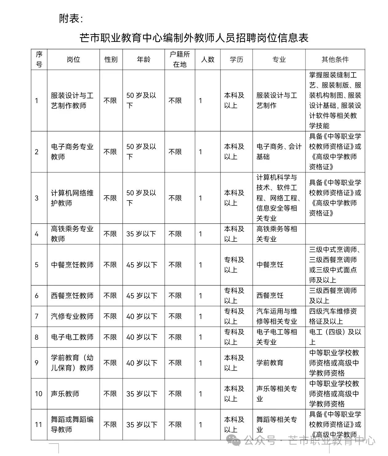 各招聘崗位的具體條件在《芒市職業(yè)教育中心編制外教師招聘崗位信息表》明確。