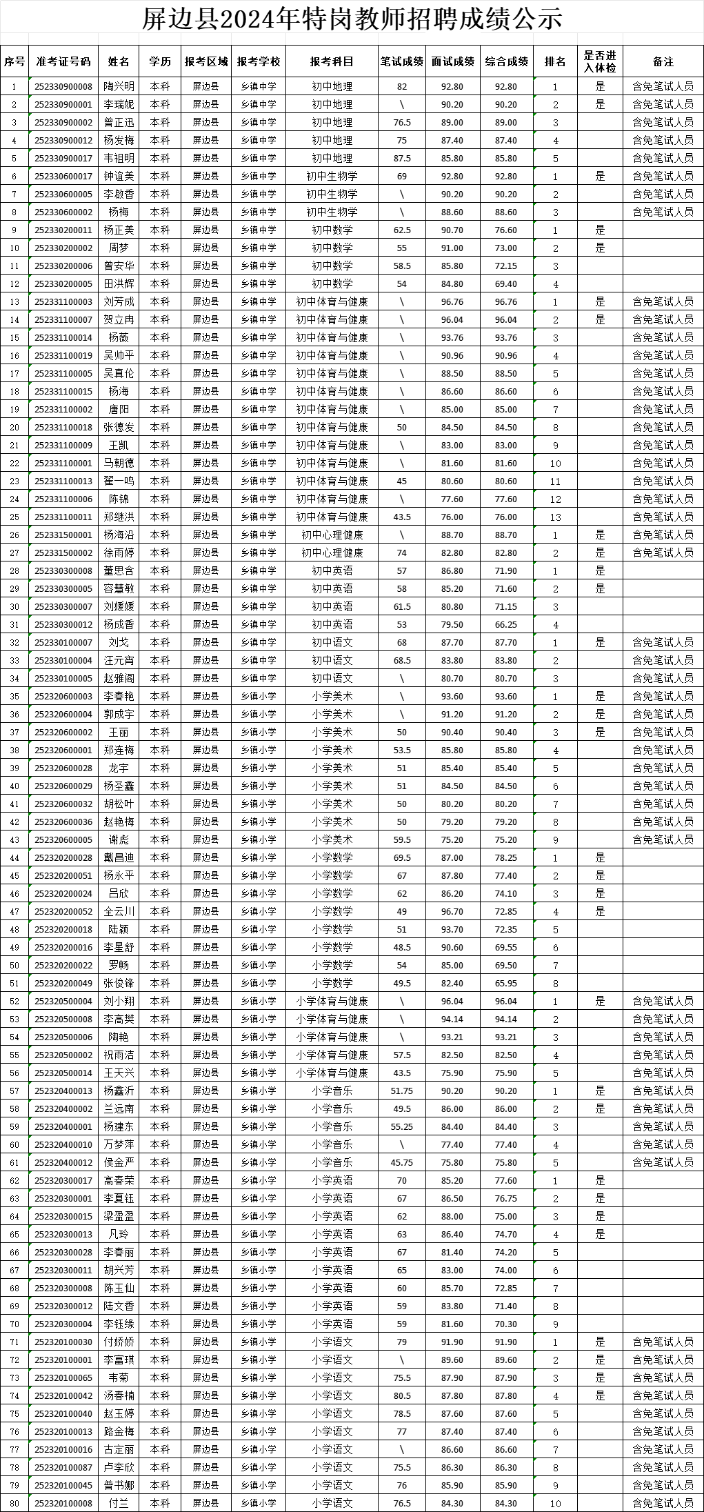 屏邊縣2024年中央特崗教師招聘成績(jī)公示