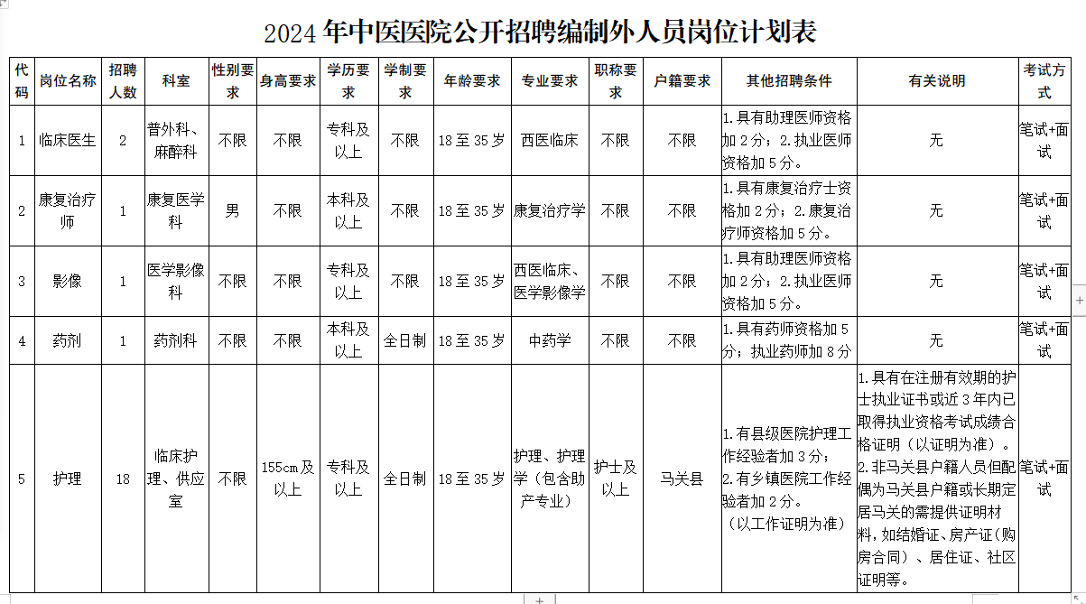 招聘崗位及人數(shù)等詳見附件1《2024年中醫(yī)醫(yī)院公開招聘編制外人員崗位計劃表》。